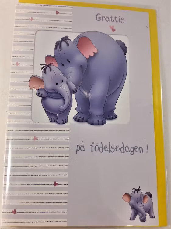 Hem › 1 › Grattiskort med elefantmotiv, utan text Grattiskort med elefantmotiv, utan text 0 kr 19 kr Grattiskort med elefantmotiv, inklusive kuvert, utan text. 18 x 13 cm. Disney. Flera populära produkter Runt örhänge i blått med guldfärgat mönster 79 kr Örhänge med vita hjärtan, sten i mitten och strass 49 kr Örhänge med silverfärg och lila facett 69 kr Brunt örhänge av trä i form av hjärta 15 kr