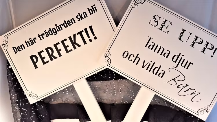 Vit träskylt med svart text - SE UPP! Tama djur och vilda Barn alternativt - Den här trädgården ska bli perfekt!.